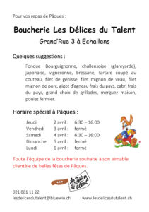 | Plats cuisinés chaque jour | Rissoles, croissants au jambon, ramequins au fromage, gratin dauphinois, poulets rôtis, langue de boeuf sauce câpres. |